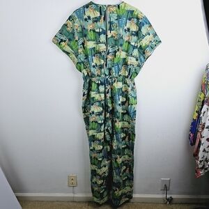 Beautiful tiger print with shades of green jungle and plant life. Elastic waist with a large keyhole opening in back with button closure. Pockets.