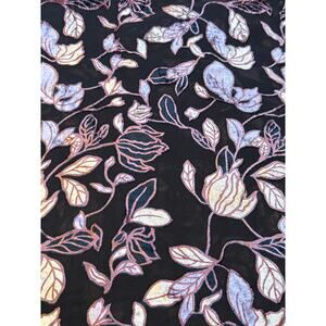 Sheer black with shades of pink, purple, gold and maroon burnout velvet flowers