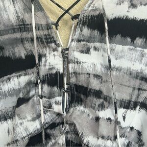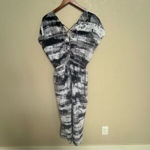 World Market jumpsuit, lace-up front jumpsuit, wide-leg jumpsuit, abstract print jumpsuit, black white grey jumpsuit, women’s S/M jumpsuit