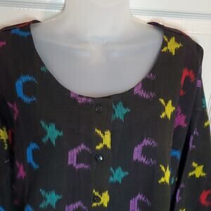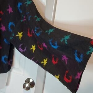 Unique one of a kind statement piece handwoven cotton made in Guatamala. Faint vertical stripes with red, blue, purple yellow stars and moon in excellent condition. Oversized sleeves. Size tag missing. Size estimated based on measurements.