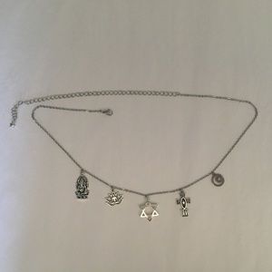The necklace features pendants from each of the five religions in the chronological order in which they were established on a silver cable chain, including (from right to left when worn) a Ganesh pendant for Hinduism, a charm of a Buddha inside a lotus for Buddhism, a Star of David for Judaism, a cross with a fish inside for Christianity, and a charm of a crescent moon with star for Islam. This unique necklace has been handmade just for you, is adjustable from 18 to 25 inches long (can be made shorter or longer upon request), and is from a smoke and pet free home.