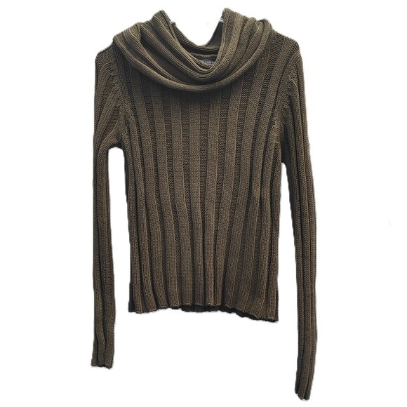 This is a sweater from World Republic Clothing Co. It is a size small. For measurements, the shoulders are 17 inches, the chest is 36 inches, the waist is 34 inches, the hips are 36 inches, the length is 21 inches, the neck is 11 inches, and the sleeves are 26 inches. It is 55% acrylic and 45% cotton and is machine washable. It is army green. It is a chunky knit sweater with long sleeves and a cowl neck. It is in excellent condition.
