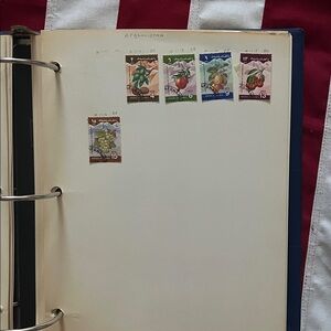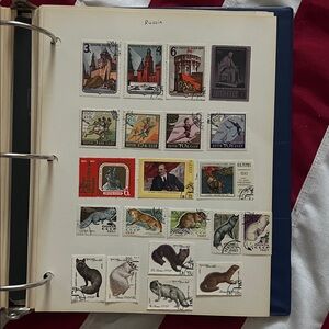 Trinidad, Singapore, New Zealand, etc.) and from unique countries and places (South Vietnam, Sharjah, Siam—and Thailand, South West Africa, Southern Rhodesia, Upper Volta, etc) and UN stamps. Russian stamps come with USSR stamps. About 100 pages (8.5x11 size pages), with each page from various countries and in various number of stamps per page. Vintage collection, including some colonial territories with some dead English Queens. All come in one package. No USA stamps in this collection.