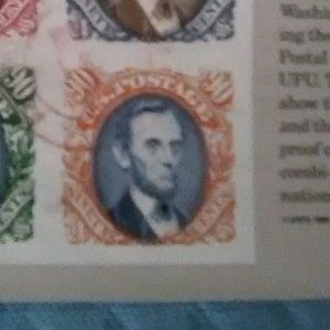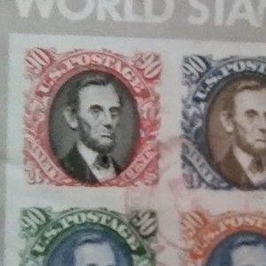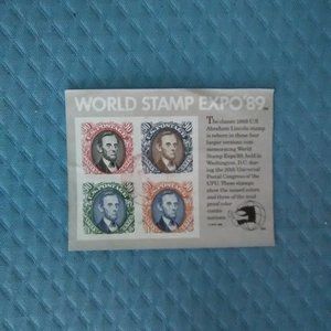 Vintage...Collectible...World Stamp Expo '89...this one sheet features four individual stamps – a reproduction of the original 90¢ Abraham Lincoln stamp of 1869 and three trial color proof combinations, which had been issued for the International Cotton Exposition in 1881. Held in Atlanta, Georgia, October 5 to December 31, 1881, this exposition was the first world’s fair to be held in the South...3.25" high x 4.25" wide...circulated through the USPS but still in good collectible condition.