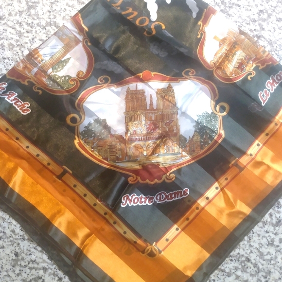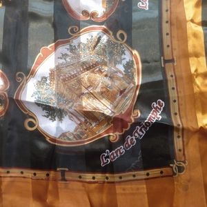 This scarf is 3 ft by 3ft! Absolutely gorgeous very gently used scarf. The main colors are gold, white, black and red. The scarf has a faux silk feel although I am very certain it's polyester.