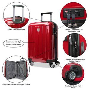World Traveler Contour 20-Inch Carry-On Lightweight Polycarbonate Hardside Expandable Spinner Luggage with TSA Lock - Red Travel in confidence with this World Traveler Luggage, crafted from high-quality, impact-resistant polycarbonate that's built to withstand the rigors of travel. Each piece features a 3-digit TSA combination lock, ensuring your belongings stay secure while allowing TSA agents to inspect your luggage without damage. With eight(8) spinner wheels, a retractable telescopic handle, and top and side grip handles, this luggage offers effortless maneuverability in any direction. Inside, you'll find a fully lined interior with a flap divider, accessory pockets, and compression straps, keeping your belongings organized and secure. The luggage is also lightweight and expands two inches for more packing capacity, making it ideal for extended trips. Constructed from high-quality polycarbonate material for exceptional durability and impact resistance Expands two inches for more packing capacity, Built-in TSA Approved Combination lock Eight spinner wheels system, push-button telescopic handle, padded top and side grip handles Interior features a flap divider, accessory pockets and compression straps 20" Carry-On Dimensions: 20" H x 13" L x 9" W - 6. 5 lb