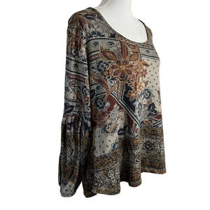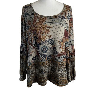 World Unity Blouse XL Floral Gray Red Knit Pullover 3/4 Balloon Sleeves Stretch