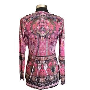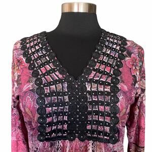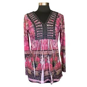 World Unity Burgundy Print Top Black Lace MEDIUM Whimsygoth Dark Fairy Y2K Boho. Black ladder lace trim around V-neckline. Long sleeves. In excellent preowned condition.