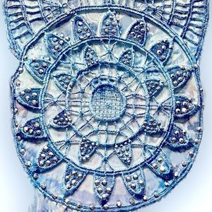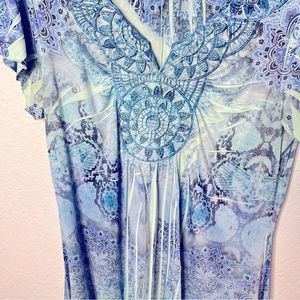 Beautiful, pre-owned, comfy Tunic top embellished in blue with tiny silver beads (may be missing a few). flutter sleeves with a V-neckline. Super comfortable, lightweight and flows beautifully over the top of your jeans, leggings or capris. See photos for measurements.