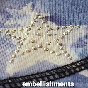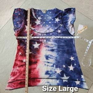 World Unity flutter sleeve top with embellishments on the upper front. The colors are red, white, and blue. The size is large, and the measurements are in the photos. It has a star print and is brand new with tags.