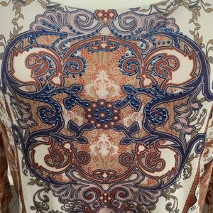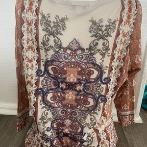 World unity size Xl top. Cute for country concert has a little western cowgirl flair to it. 4 inches longer in the back. Really cute design. The front has a little blue rhinestones 100% polyester.
