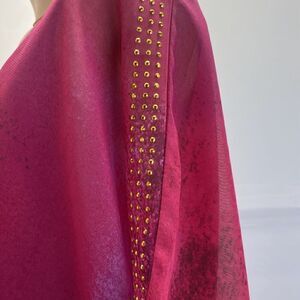 This beautiful pink blouse from World Unity is perfect for any occasion. The scoop neckline and cap sleeves provide a comfortable and relaxed fit, while the gold studded trim adds a touch of elegance. The blouse is made from a knit lining and chiffon overlay fabric, making it lightweight and easy to care for.