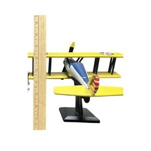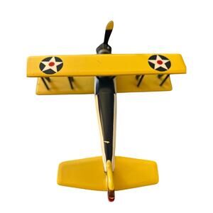 World War I Era U.S. Army Air Corps Model Biplane. This model plane features a red and white striped tail rudder, a working propeller, U.S. Army Air Corps insignia on the wings. Small chips in the wood as detailed in the photos, but otherwise in good vintage condition.