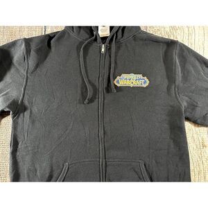 World of Warcraft Horde Black Hoodie. Size large. In good condition. Has light wear. Horde logo embroidered on the back of the jacket. Drawstrings around the hood. WOW logo on the left chest.