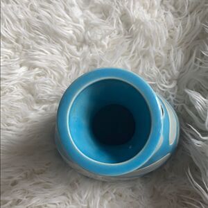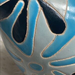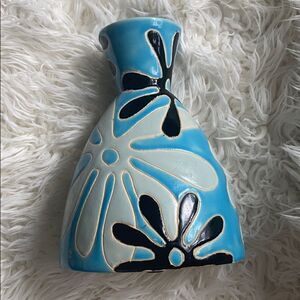 Beautiful textured vase in blue, black & white patterned n great condition. This is a statement piece to add to your decor.