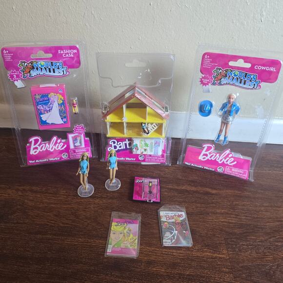 World's Smallest Toys Barbie Bundle. Includes: Barbie Malibu Dream House, Cowgirl Barbie, Micro African American Malibu Barbie, 2 Mini Malibu Barbies with stands, Barbie Fashion Case with Micro Totally Hair Barbie + 1 Mystery Barbie, 2 Mini Barbie Comics.