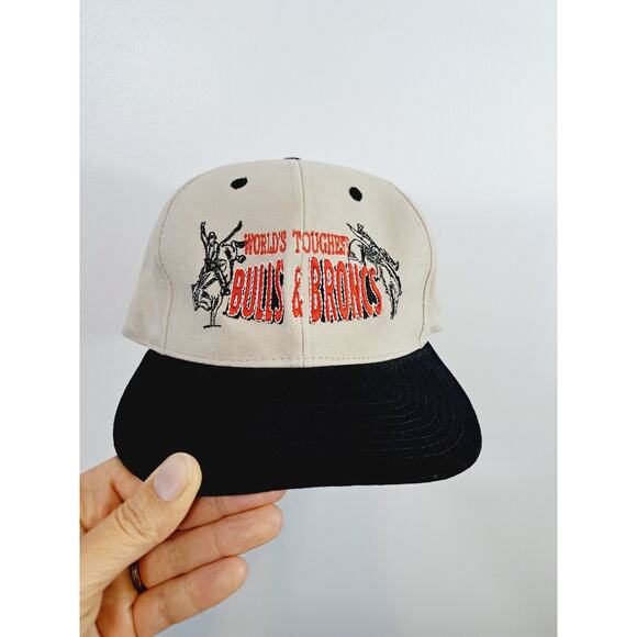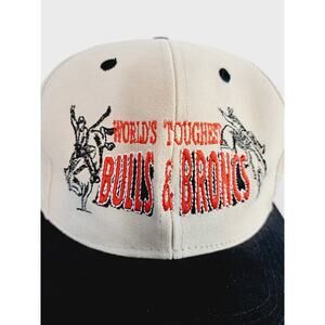 Show off your style with the World's Toughest Bulls & Broncs hat. Featuring a bold black and cream design, this hat is perfect for any casual outing. Vintage western rodeo