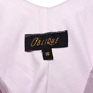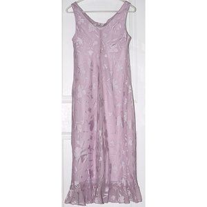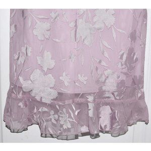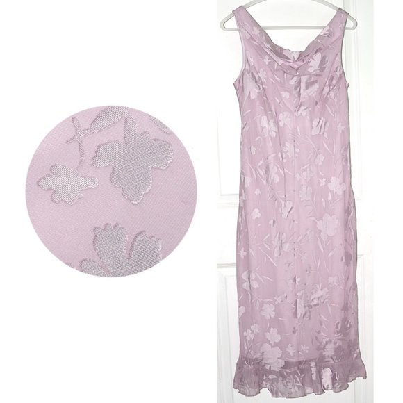 Worn 1X, for a wedding (bridesmaid). Vintage from the early 00s (I think it was 2003, specifically) / Y2K. Color is a dusty rose that’s a little more pink. Has lighter-pink (or silvery), shimmery appliques that look lighter or darker depending on angle. Bias cut, so can fit a range of sizes. Cowl neck front, V-back. Ruffle hem. Lined. This is from a store in Canada, but I can’t remember which one. I'm the original owner. I don't see any flaws.