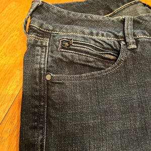 Worn Jeans, woman’s size 6 (28). These are five pocket jeans. The back pockets have zippers as closure. They are in great condition with no rips, stains or holes. The rise is 8.5 and the inseam is 30