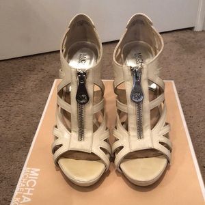Worn a few times Michael kors heels. Color is called vanilla it is more like a cream patent leather Spring cleaning as I tore ligaments in my foot and have no need for all these heels in my closet. Has a little discoloration only by toe area Pictures show this. Will come with original box as well.