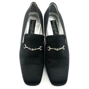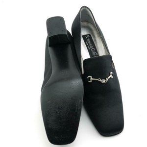 Vintage 90s KENNETH COLE chunky heel pumps. Size 8. Uppers are black fabric. Lined with silky calfskin. Decorative horsebit buckle with small rhinestone in the center. Made in SPAIN. LIKE NEW condition. Uppers and insoles are immaculate, soles show almost no wear.