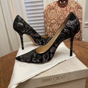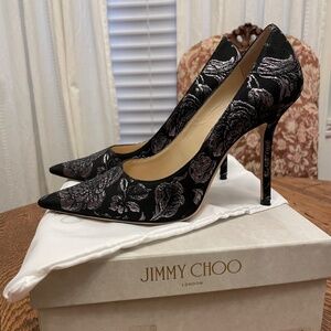 Worn once - Jimmy Choo Love 100 mm Heels Brocade in Black/Steel- Size 38