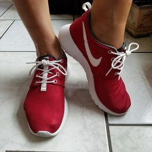 Red Nike Roshe's worn for 15 min. So new in box. Red white and gray. Super cute and clean size 5.5y or 7 woman's