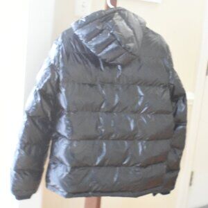 Warm, stylish, and worn only once. It was too big, so it is for sale. Shiny/pearlized finish, puffer look, front zipper, zipped pockets, attached hood, warm like down, wind resistant, and water resistant. This size (M) is out of stock on Amazon. Same jacket in other finishes are being offered for more than $100. This is a great deal!