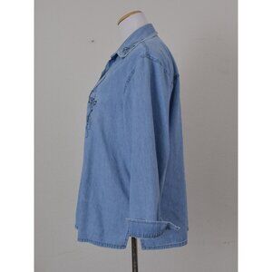 Cotton button-up denim shirt. Condition is worn, it shows signs of wear and minor discoloration. Missing buttons on the collar and also the collar button.