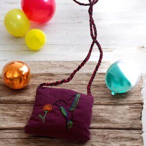 This handmade necklace is made with yarn and small cloth sacks filled with sage and aromatic desert plants, decorated with hand-embroidered figures. An accessory full of tradition and symbolism, created with love by the Seri community in Sonora, Mexico.