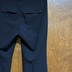 Gorgeous black pants with zipper closure slant pockets on hip. Snap closure pockets on back. Zipper and hook closure. Decorative seem on back of knees.