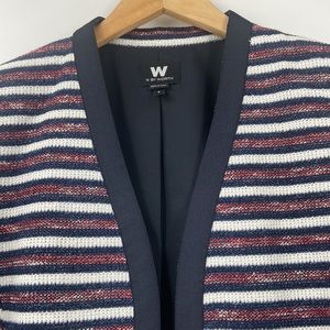 Classically beautiful, multi striped design colors of burgundy, white and what looks like in my opinion a deep navy blue, perfect career, office, work, event, easy to dress up a plain pair of pants or skirt, nice over a dress, great seasonless dressing, love the slant design double pockets in front with working zippers, so nice for the office, fabric has a substantial quality feel, elegant and easy to wear, beautiful condition, looks almost new, beautiful blazer jacket. Size 8