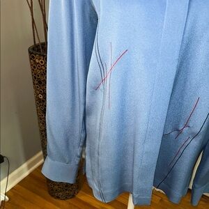 Elegant blue blouse with unique red stitching. Long sleeves and classic collar. Perfect for any occasion.