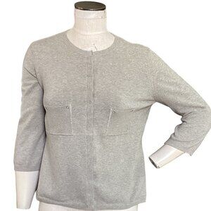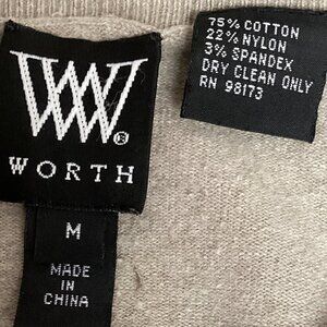This Worth cardigan sweater in size M is the perfect addition to your wardrobe. With a solid pattern and tight-knit style, this sweater is suitable for both casual and business occasions. The 3/4 sleeves and crew neckline provide a classic look while the collarless design and lightweight, breathable fabric add a touch of modernity. The sweater comes in a beautiful taupe beige color and features stretch material, making it comfortable to wear. The sweater also includes pockets for functionality. Made from a cotton nylon spandex blend and crafted in China, it's an excellent choice for any season. The sweater is dry clean only.