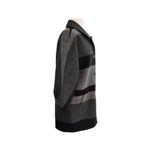 W by Worth gray oversized wool blend coat with large colorblock grey and purple/maroon stripes. Side hand pockets. Inner lining. Front button closure. Excellent condition.