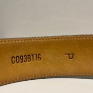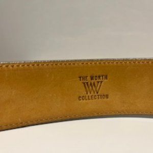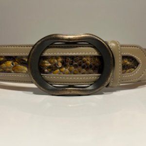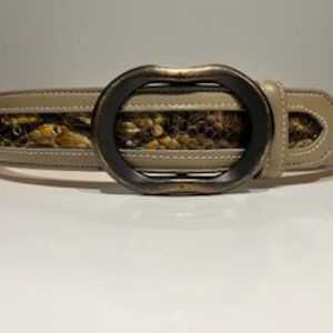 Description: bronze colored buckle with faux glossy snakeskin embossed leather with smooth leather trim. Trim is tan with greenish tone; faux snakeskin has shades of tan, gold, green and black. Looks great over a shirt or sweater cinched at the waist.