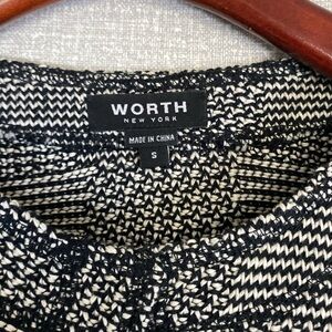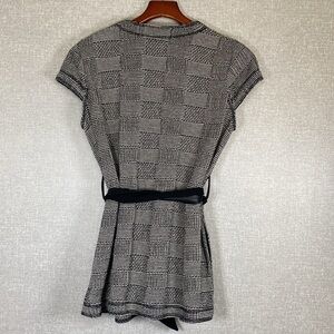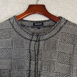 Worth New York Black and White Checkered Pattern Knit Long Leather Tie Snap Vest EUC Size S Beautiful Vest with cap sleeve Snap front and soft leather tie. Long line that would look beautiful with tights or leggings and tall boots or with Jeans. Has front side pockets. Dress is 100% Cotton and belt is 100% leather. Heavyweight cotton Very high quality