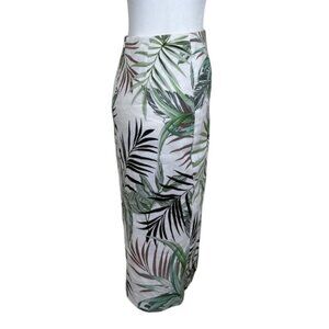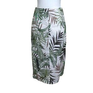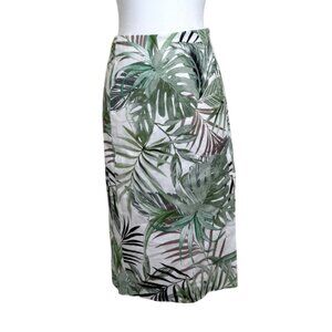 Worth New York Pencil Skirt Front Slit Tropical Print Green White Linen Size 0