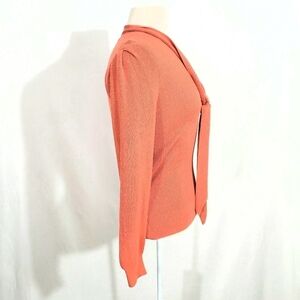 Worth knit v-neck ribbed sweater in orange. Shimmery gold thread creates a shein. Attached coordinating neck scarf tie. Subtly pleated feminine puffed sleeves. Small pull on right sleeve (pic 5), otherwise very good condition. X-Small.