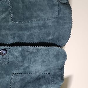 Beautiful dark teal leather jacket by Worth. Size 8. Genuine suede leather. Vintage jacket. Lining is Acetate. Small stain on the back. See picture. Two functional pockets in the front. Three buttons down the front. Care tag included. Dry clean only.