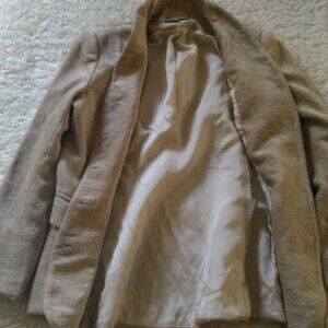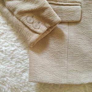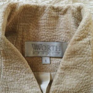 Worth textured beige blazer. Velour soft fabric. Shawl-like v neck collar. Full button front. Lightly padded shoulders. Pockets with flaps. Fitted. Fully lined. Excellent gently used condition. No material/care tag. Size 6Petite