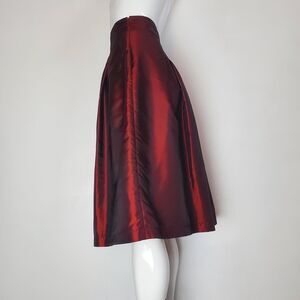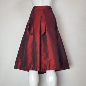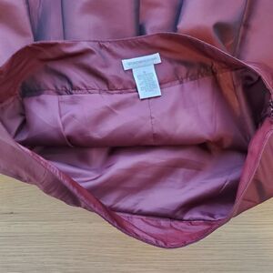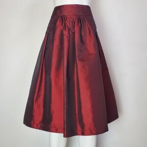 Worthington late 2000s burgundy taffeta pleated knee-length full skirt. High-waisted with side hook/zipper closure and inner lining. No pockets.