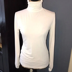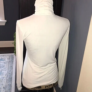 Polyester and spandex blend turtleneck. Ruche detailing on neck and arms