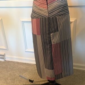 Elegant A-line skirt with a modern striped design. Features pink and black hues for a stylish look.