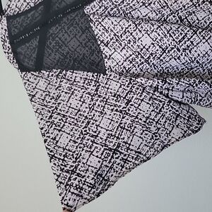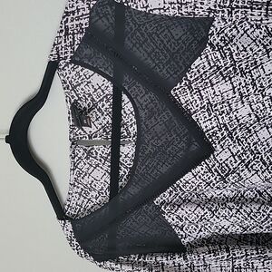 Black and white crosshatch like pattern. Has a sheer panel at the chest. Has a ladder like trim around the sheer panel. Keyhole opening in the back with a single button closure. There are a couple of runs in the fabric in the front, towards the bottom and one at the chest, see close ups. I feel they are very hard to see due to the busy pattern. Fabric doesn't stretch and is slightly sheer. Office, workplace, witchy, goth, career, brunch, dinner, date night, dressy.