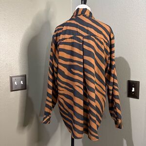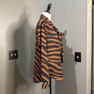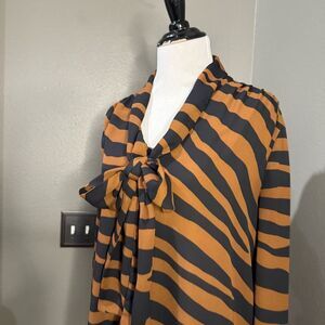 Worthington Animal Print Button Down Blouse Tie Neck Black Brown Striped