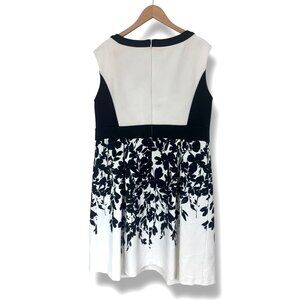 The dress is sleeveless and features a color block design, with a black band at the waist, and a skirt that transitions from black floral patterns to off-white at the hem.