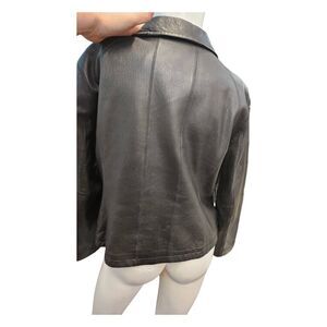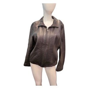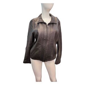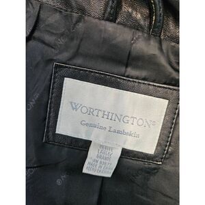 Worthington black leather full zip jacket size large petite. Soft leathef- perfdct worn in look. Good used condition.