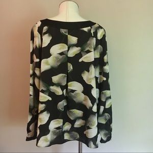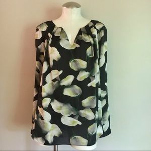Worthington Black Lily Print Blouse. Beautiful silky black blouse with lily floral print. Great formal/career wear. Gently used condition. 100% polyester. 54 in. bust. 28 in. length from neck.