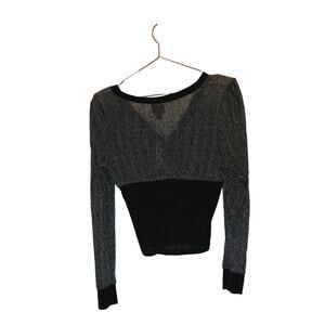 This is a beautiful Worthington black button-down sweater with sheer silver sparkle, perfect for adding a touch of elegance to any outfit. It is in great condition and comes in a size large.